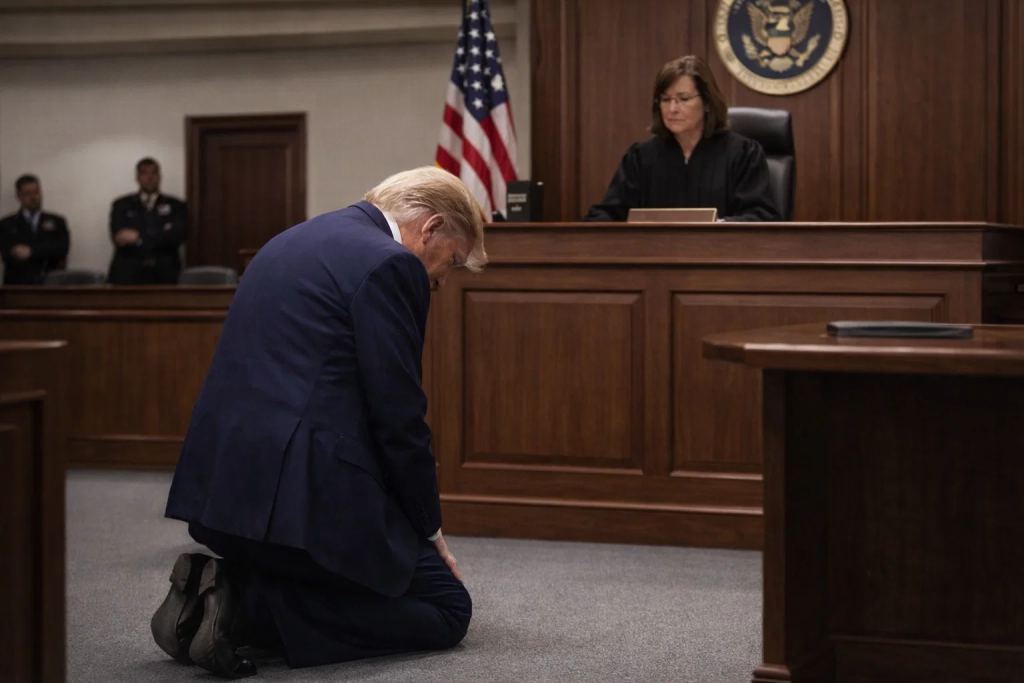 The image of Donald Trump kneeling before a judge shatters an illusion of invulnerability that has defined his public life.